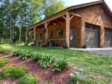 Outdoor Space: Covered porch with seating, ideal for relaxing, enjoying a drink, or spotting wildlife in the wooded surroundings.