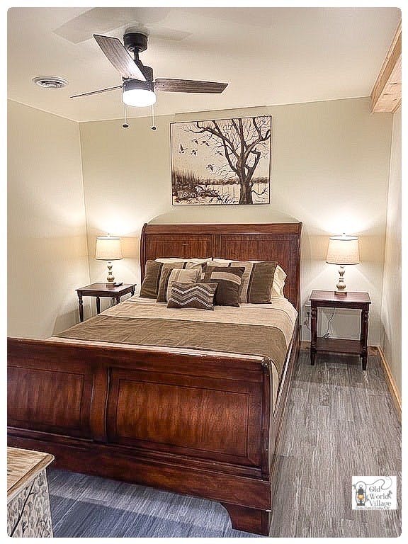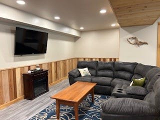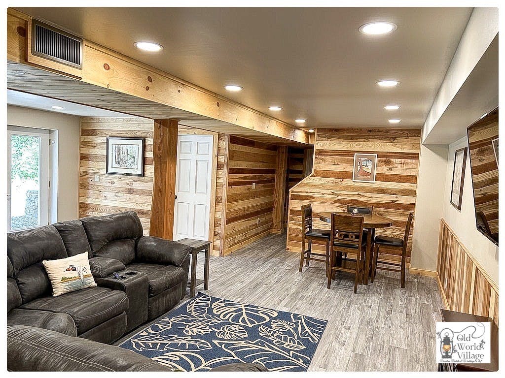 Lower Level: Private queen bedroom with a nearby full bathroom, an additional living room, and walk-out access to the new 7-person hot tub.